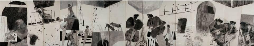 A Ribeira Negra, que eu tenho aqui no Porto, é a segunda versão da Ribeira, que eu pintei, com quarenta metros. É uma obra que nunca foi vista em Lisboa. Esteve em Madrid, uma vez. É um trabalho curioso. Foram 120 metros quadrados, quarenta por três, mas que foram feitos em segmentos de quatro metros cada um, aqui, num atelier pequenino de cerâmica. Dispunha de quatro metros, mandei pôr a régua e cortei o pano, que ia suspendendo com umas tachinhas e ia pintando e ia pintando. Foi uma coisa que saiu sem eu estar a ver o conjunto, embora sentisse mais ou menos o ritmo. Mas aquilo não tinha o espaço adequado. Medi a passos o local para onde foi feito o painel e vi o que precisava de quarenta metros. Fiz aquilo rapidamente, em quinze dias.