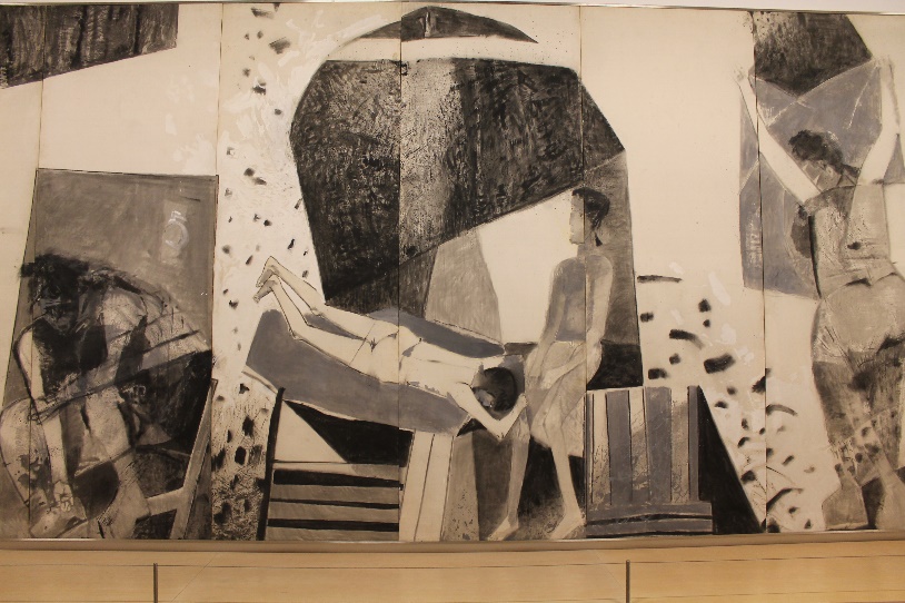 Corri à Rua das Flores a comprar uma peça de lona, e disparei para o atelier. Dispunha de uns escassos 10 dias para 120m2 do painel. Polivinil seria a técnica; negro de fumo e óxido de zinco, os pigmentos. De 4 em 4 metros, fui pintando sucessivamente a extensão dos 40 metros de parede, sem qualquer hipótese de voltar atrás. Ou ter uma visão de conjunto.